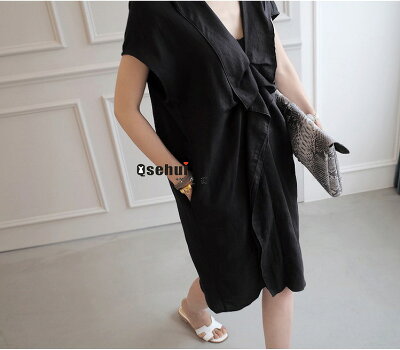 麻のストレートワンピース フリル V襟 フレンチスリーブ お出掛け 半袖 大きいサイズ有り S〜XXXXL 大人スタイル 【クリックポストで送料無料】