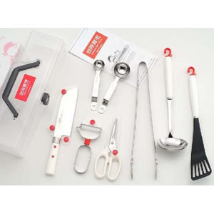 【セット内容】 ・包丁(大) ・キッチンはさみ ・ピーラー ・計量スプーン ・さいばしトング ・お玉 ・ナイロンフライ返し(小) ・専用収納BOX サイズ・重量 【包丁(大)】 :233×40×18mm 刃渡り 約13cm・77g 【キッチンはさみ】 :160×65×10mm・56g 【ピーラー】 :123×63×16mm・58g 【計量スプーン(大)】 :145×42×20mm 【計量スプーン(小)】 :135×30×13mm 【さいばしトング】 :300×45×22mm 【お玉】 :275×73×60mm :お玉容量45cc 【ナイロンフライ返し(小)】 :297×50×32mm 材質 【包丁】 刀身: ステンレス刃物鋼 柄部: ABS樹脂(耐熱温度 60度) 口金: ステンレススチール 刃カバー: ポリプロピレン(耐熱温度 70度) カバーホック: POM樹脂(耐熱温度 120度) 【キッチンはさみ】 刀身: ステンレス刃物鋼 柄部: ABS樹脂(耐熱温度 60度) 刃カバー: EVA樹脂(耐熱温度 60度) カバーホック: POM樹脂(耐熱温度 120度) 【ピーラー】 刀部: ステンレス刃物鋼 樹脂部: ABS樹脂(耐熱温度 60度) 本体: 18-8ステンレススチール 刃カバー: ポリプロピレン(耐熱温度 70度) カバーホック: POM樹脂(耐熱温度 120度) 【計量スプーン】 本体: ステンレススチール 【さいばしトング】 本体: ステンレススチール 【お玉】 柄部: ABS樹脂 金属部:ステンレススチール 【ナイロンフライ返し(小)】 柄部: ABS樹脂 フライ返し:66ナイロン
