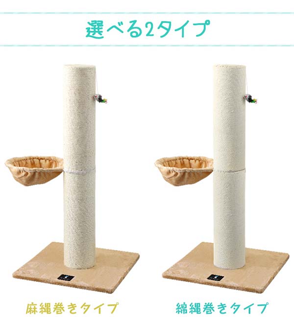こんな方におすすめ!□家具や壁に傷を付けたくない□丈夫な爪とぎがほしい□高さのある爪とぎが欲しい□多頭飼いのお客様に□インテリアにこだわっている 支柱タイプ: ・麻縄巻きタイプ ・綿縄巻きタイプ サイズ: 最大サイズ:高さ122cm×幅77cm ※土台:幅60×奥行き60cm/厚さ2cm ※ポール…高さ120cm/直径19.4cm 材質: ■麻縄巻きタイプ 支柱 : 麻縄巻き 張り材 : 生地(ポリエステル) 板材 : パーティクルボード ■綿縄巻きタイプ 支柱 : 綿縄巻き 張り材 : 生地(ポリエステル) 板材 : パーティクルボード 重量: (約)9kg 耐荷重: ・極太猫爪とぎポール本体…(約)15kg ・ハンモック…(約)6kg 組み立て時間の目安: (約)10分 特記事項: こちらの商品はお客様組み立てとなります。