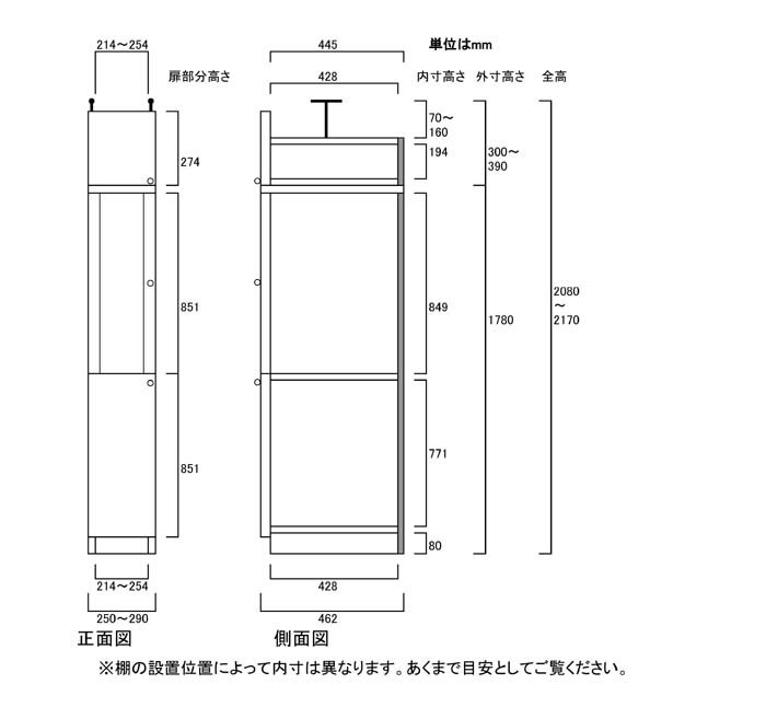 深型隙間収納書庫高さ208〜217cm幅25〜29cm奥行46cm厚棚板(棚板厚2.5cm) 本体棚扉サイズ:全面扉(上部半透明)(高さ=ラック高さ178cm+突張棚高さ23cm+伸縮突張金具)半透明片開き扉深型隙間収納書庫