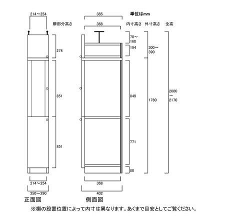 全面扉隙間書庫高さ208〜217cm幅25〜29cm奥行40cm厚棚板(棚板厚2.5cm) 本体棚扉サイズ:全面扉(上部半透明)(高さ=ラック高さ178cm+突張棚高さ23cm+伸縮突張金具)半透明片開き扉全面扉隙間書庫