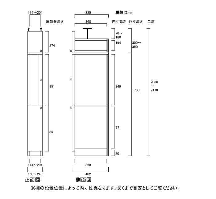 スリム収納木製本棚高さ208〜217cm幅15〜24cm奥行40cm厚棚板(棚板厚2.5cm) 本体棚扉サイズ:全面扉(上部半透明)(高さ=ラック高さ178cm+突張棚高さ23cm+伸縮突張金具)半透明片開き扉スリム収納木製本棚