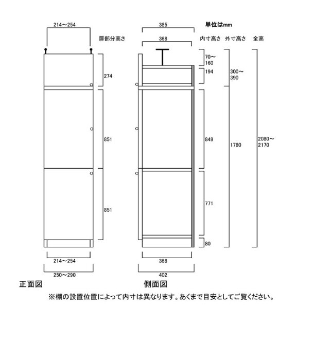 15cmから最大で90cm(棚板厚が標準:17mmタイプは70cm)まで指定できるので、設置場所にピッタリ収まる収納を実現! 全面扉タイプなのでホコリや日焼けを防ぎ、見た目もスッキリ。
